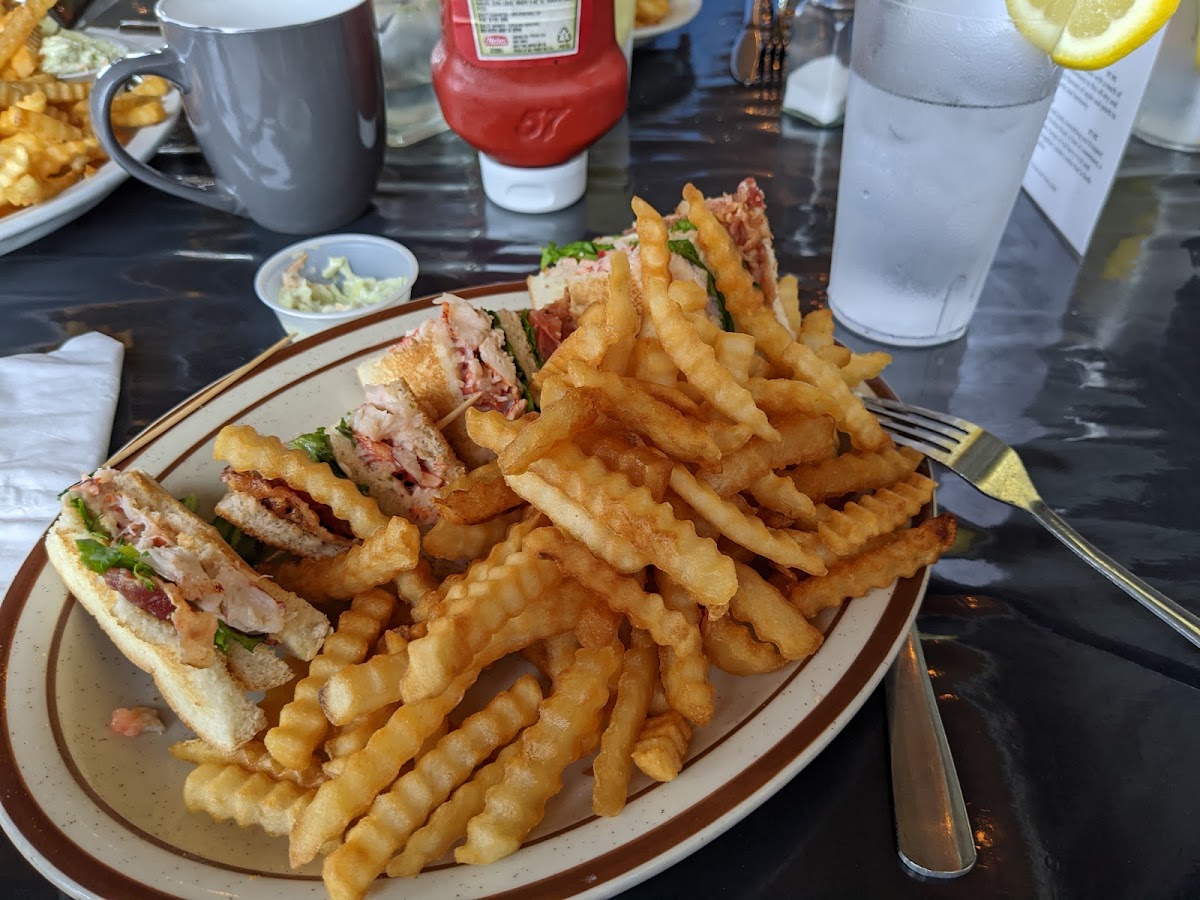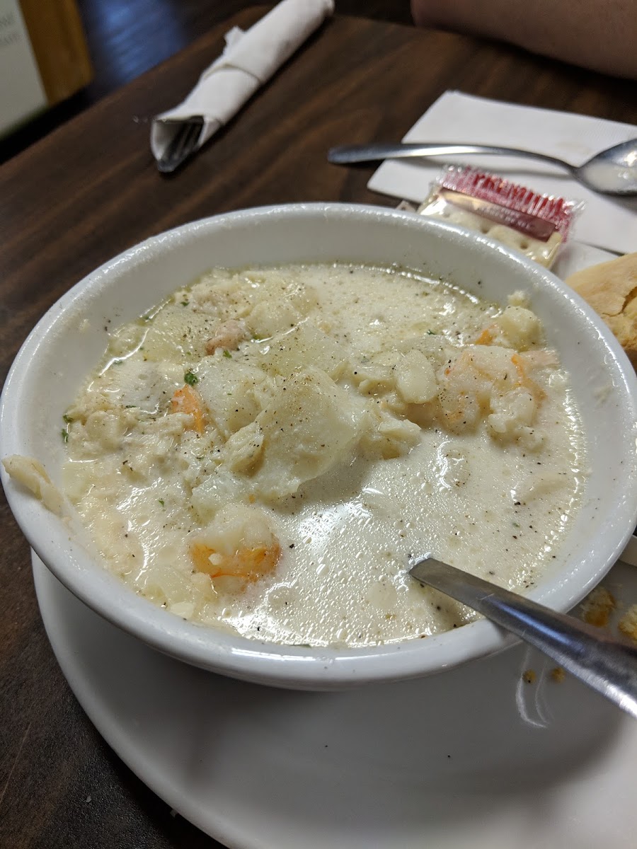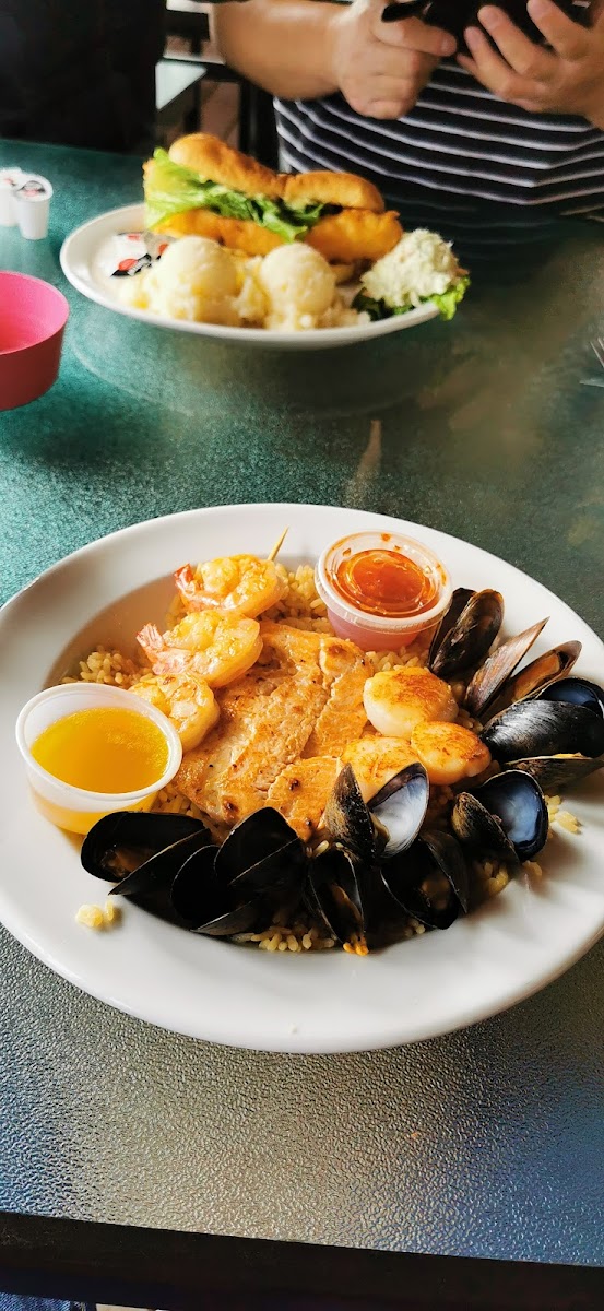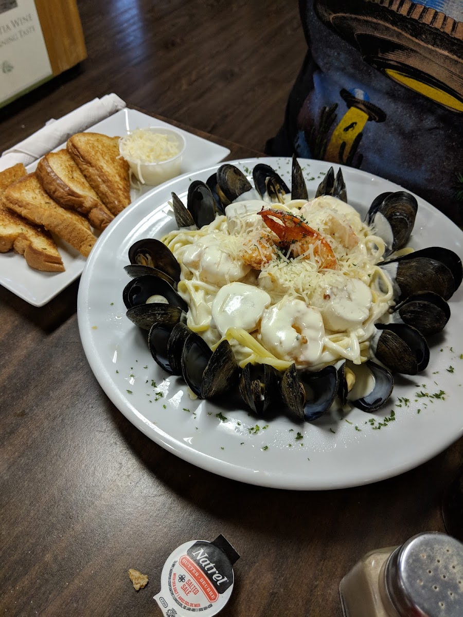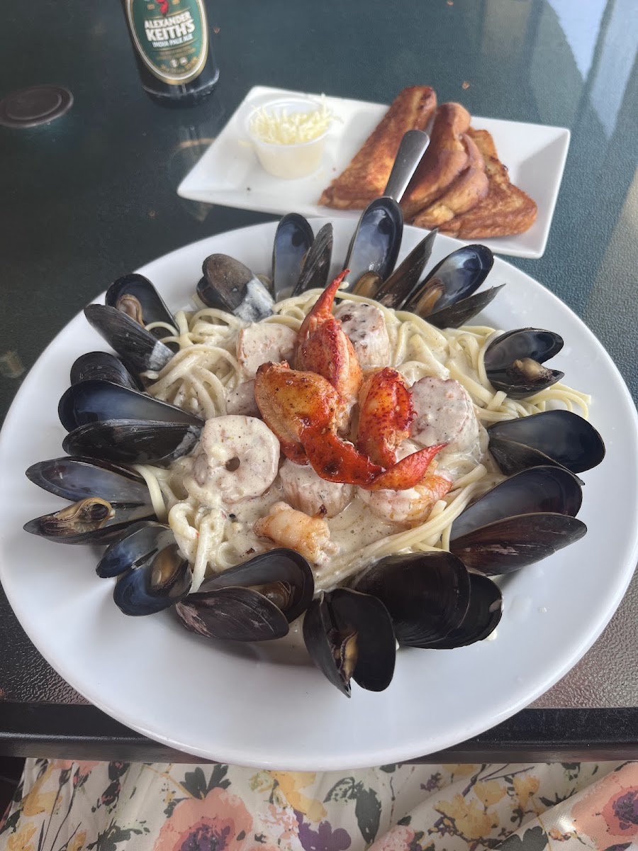 Fantastic service. What a beauty view overlooking the ocean!! We all had large portions, great seafood -mussels, chowder, lobster, scallops - also had Alfredo chicken linguine which was great. The desserts were OVER THE TOP! So good! Only the coconut cream pie needed some work...a bit too much gelatin so it wasn't 'creamy'. The Ginger spice cake with caramel sauce was unreal! Same with the strawberry shortcake. Just like my grandma makes it! So glad we stopped here.